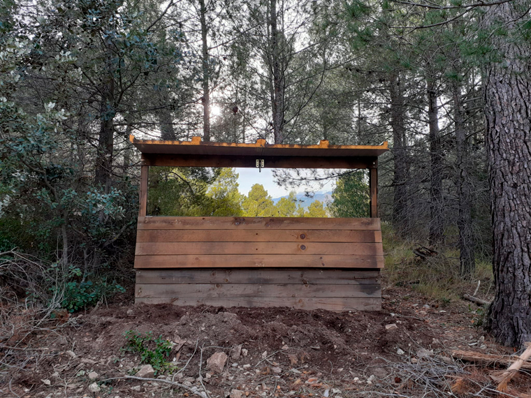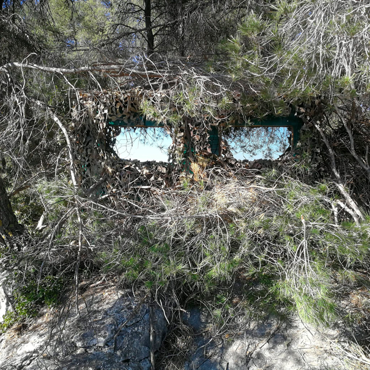 Dwergarend: Fotohut voor 2 personen, in het hart van een dennenbos, voor de ochtend. Ga ‘s middags iets verder in de bergen van Murcia voor een sessie waar alles wordt gedaan voor de best mogelijke fotografische ervaring, voor de Zwarte Tapuit en de elegante Blauwe Rotslijster.